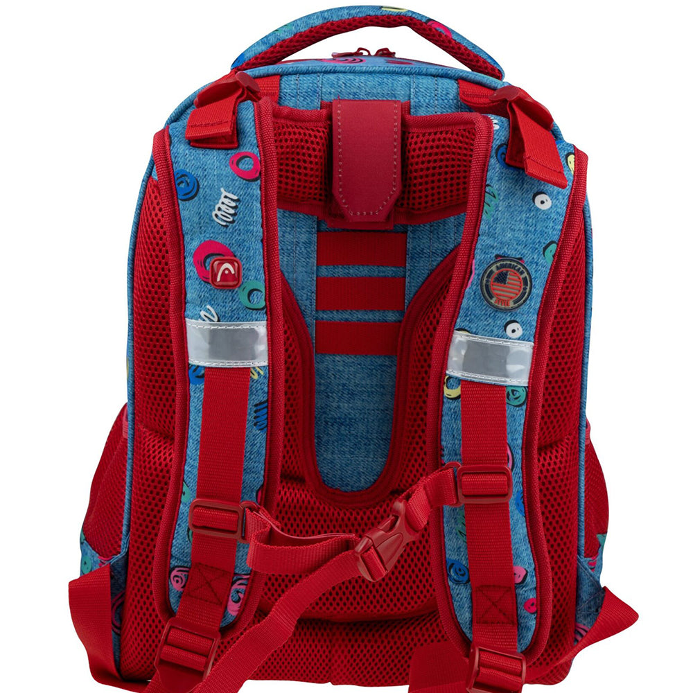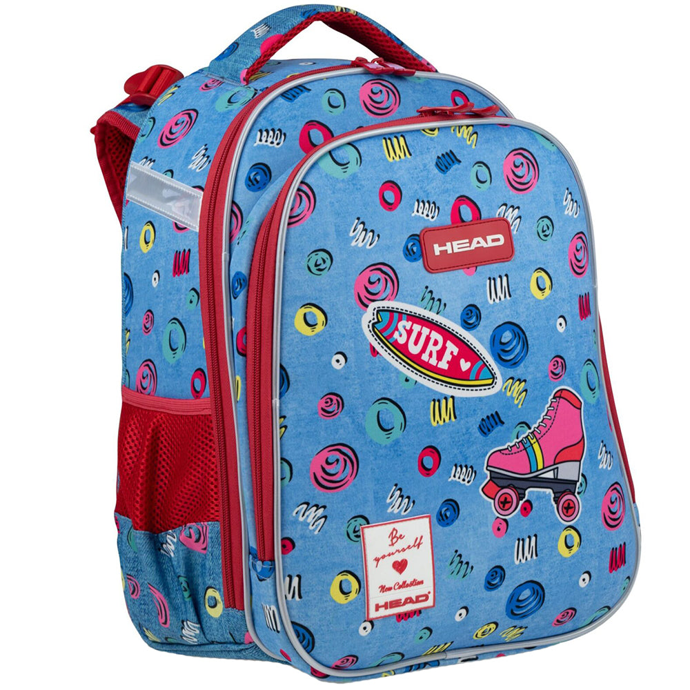 Ghiozdan pentru scoala fetita albastra cu imprimeu retro. Patine cu rotile, roti pastel, o placa de surf. Acest motiv vesel va atrage orice fata care apreciaza un stil de viata activ. Compartimentul incapator poate gazdui mai multe manuale, caiete si un penar. Geanta Head a fost conceputa in primul rand pentru a avea un spate sanatos. Buretii profilati special si hamul reglabil garanteaza siguranta fiecarui copil!