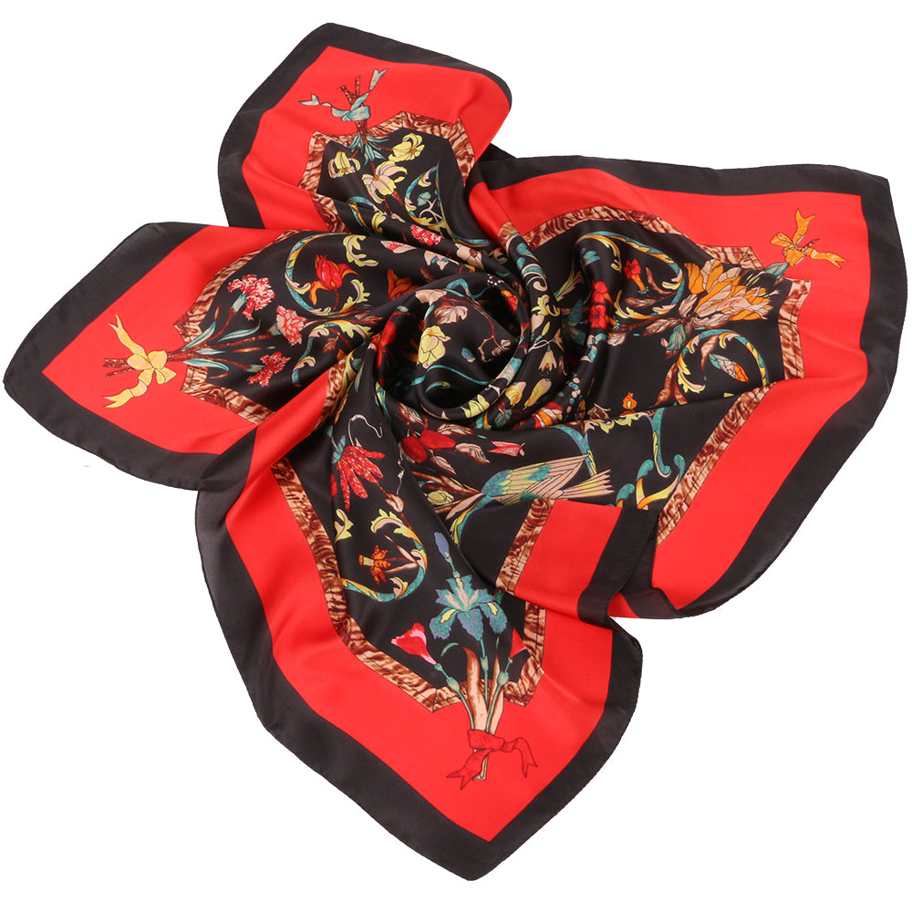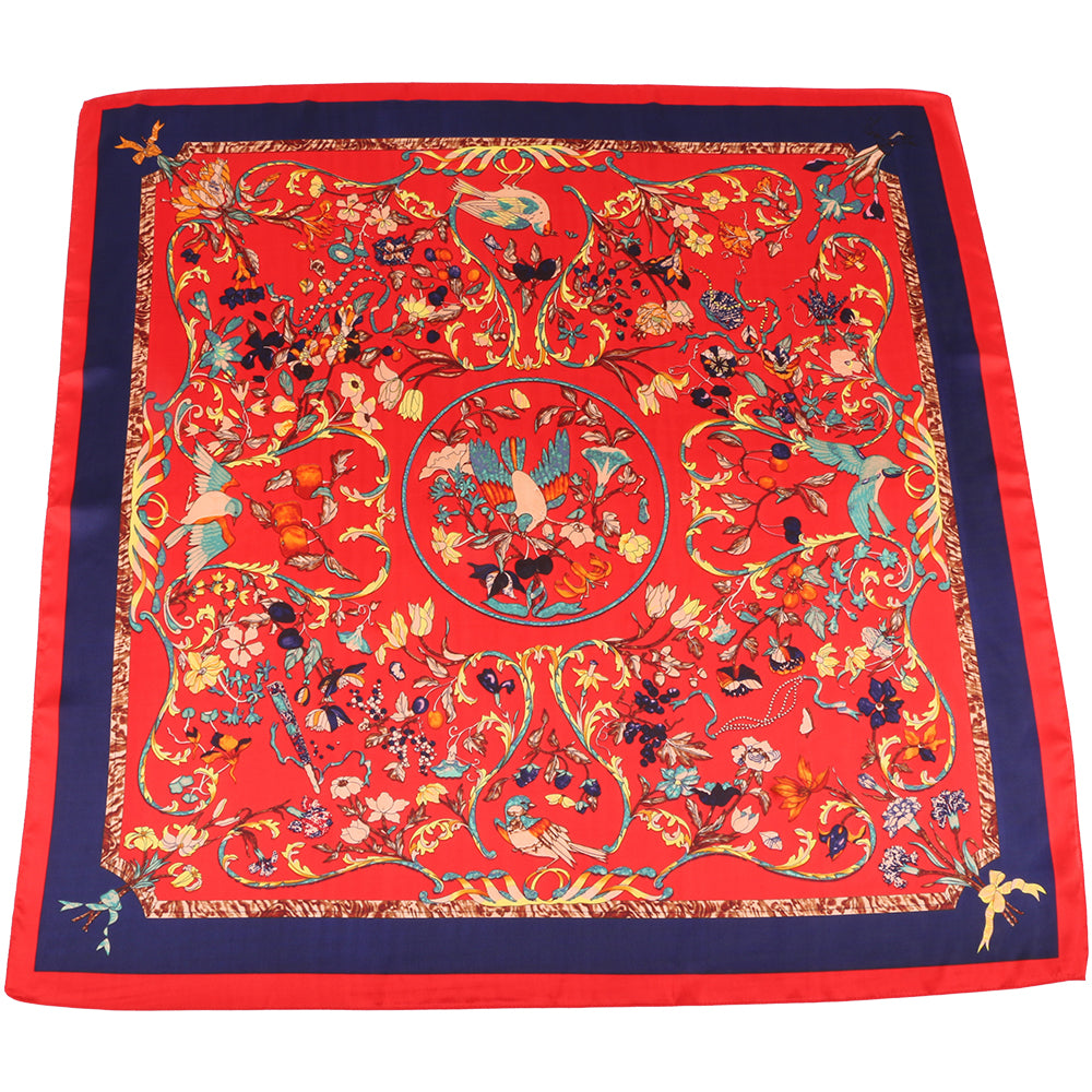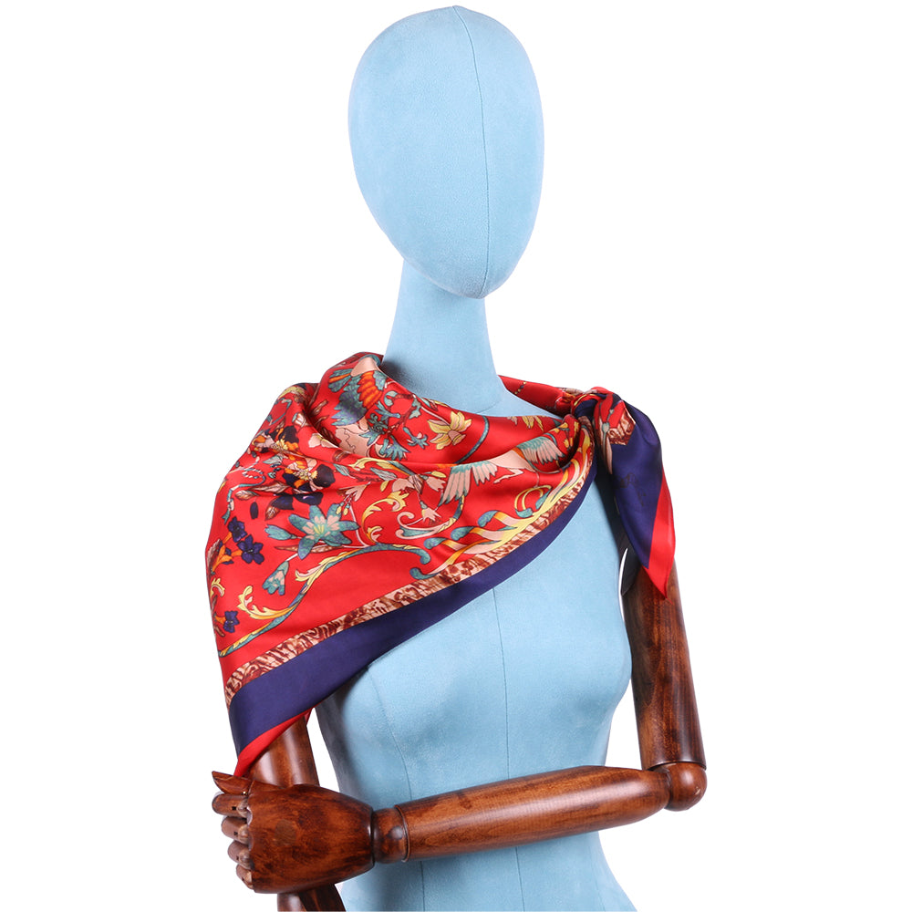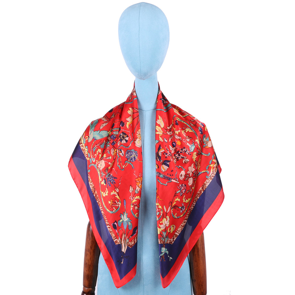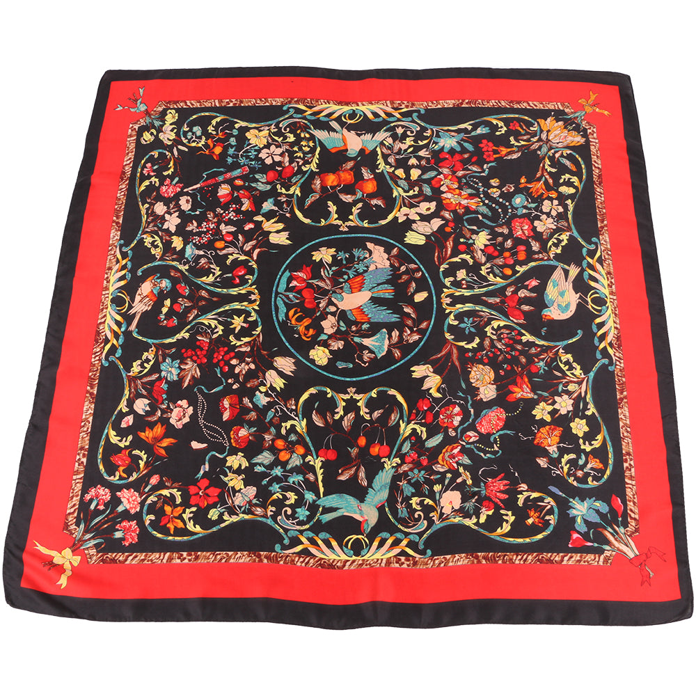 Esarfa pentru dama, imitatie matase, eleganta de forma patrata 90 x 90 cm, imprimeu gradina cu pasari, ROCS SK05