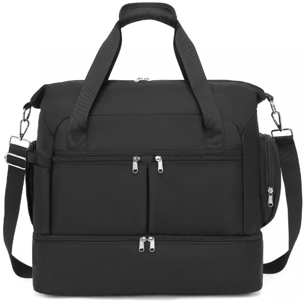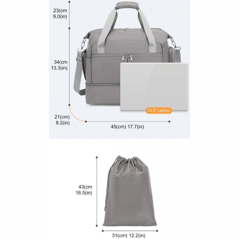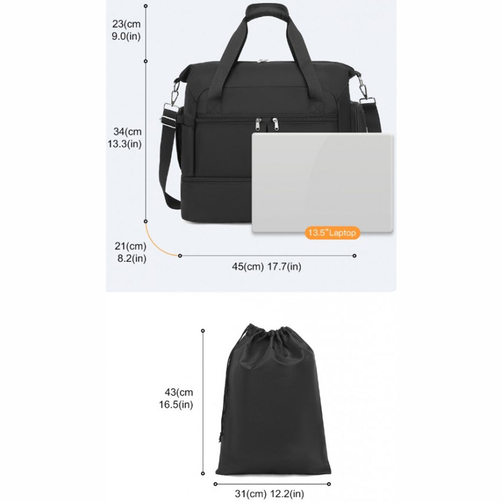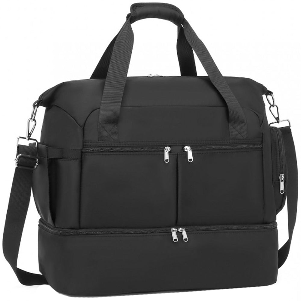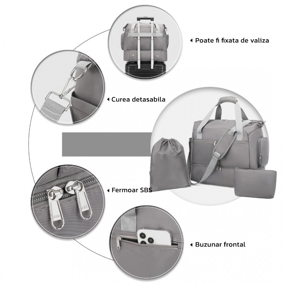 Compartimentul principal contine doua buzunare frontale pentru articole mici, completate de un buzunar din spate cu fermoar care asigura o separare eficienta intre umezeala si uscata. Partea inferioara a gentii are o caracteristica inovatoare: un compartiment independent pentru pantofi cu orificii de aerisire, accesat printr-un fermoar dublu, asigurandu-va ca pantofii raman separati de haine. Exista un alt buzunar