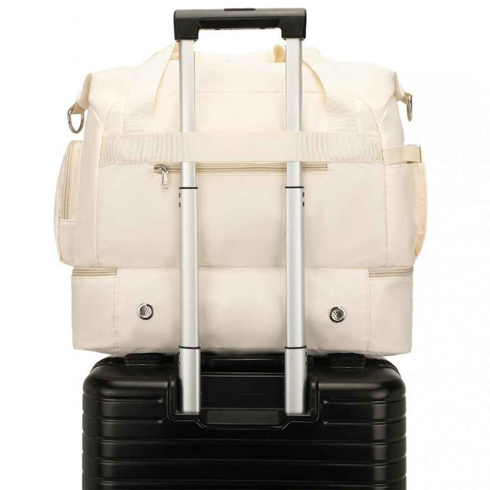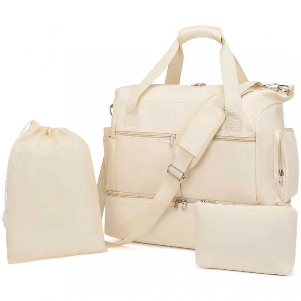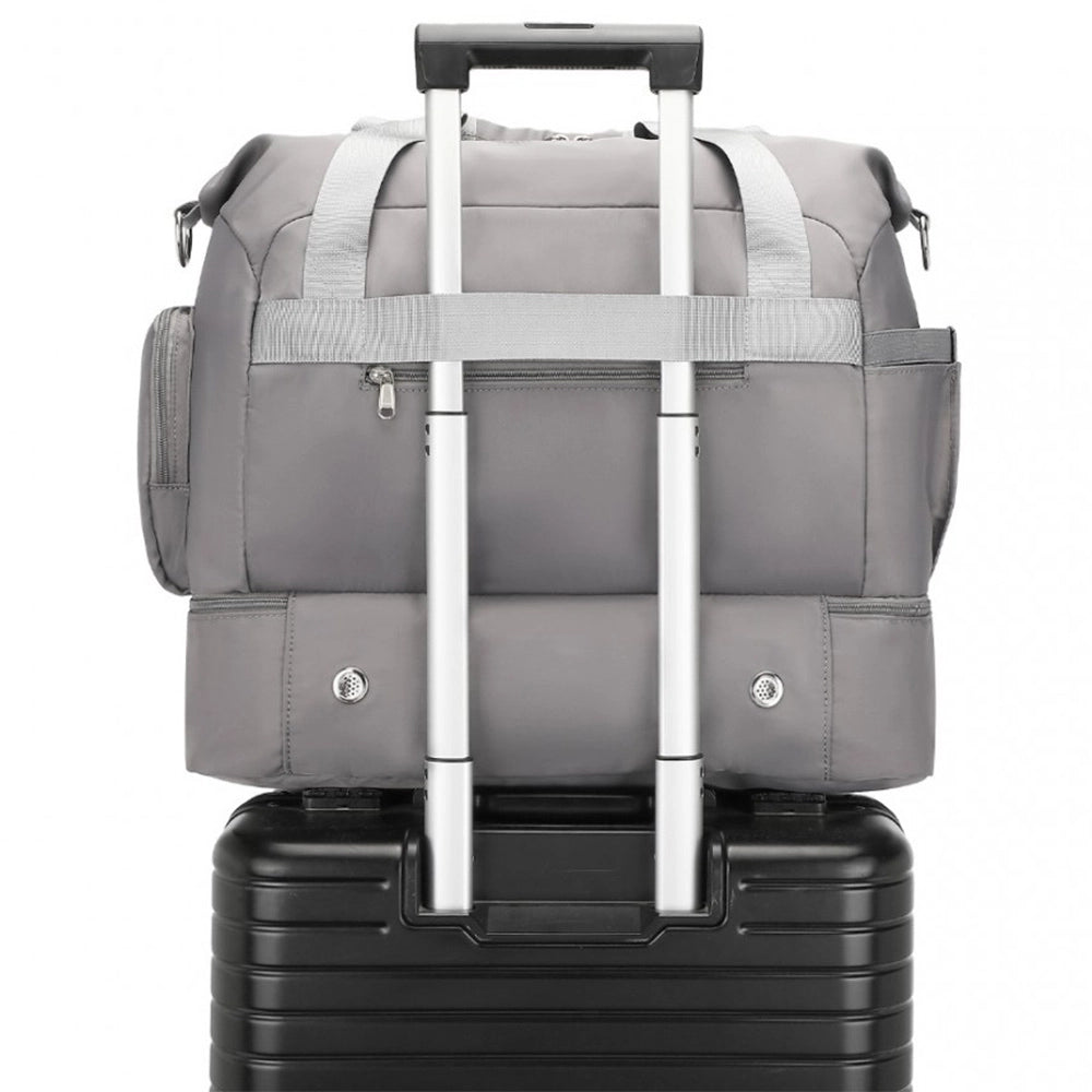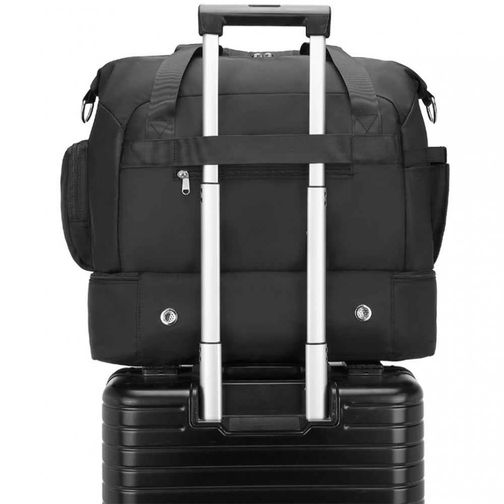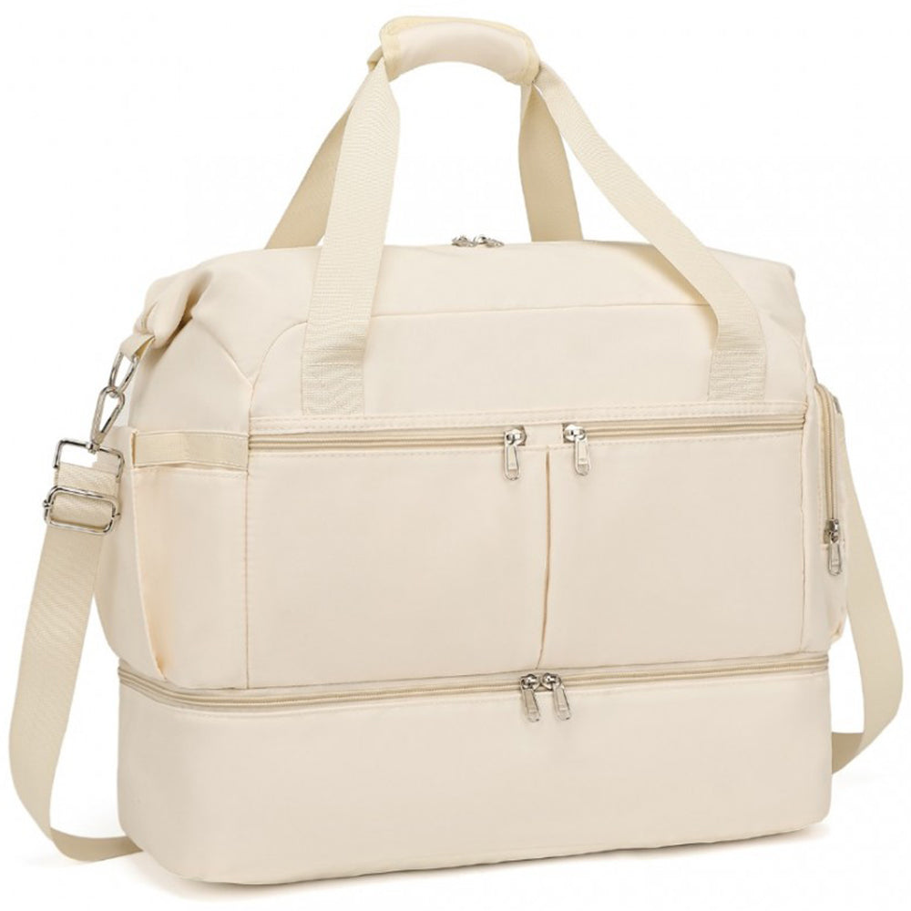 Compartimentul principal contine doua buzunare frontale pentru articole mici, completate de un buzunar din spate cu fermoar care asigura o separare eficienta intre umezeala si uscata. Partea inferioara a gentii are o caracteristica inovatoare: un compartiment independent pentru pantofi cu orificii de aerisire, accesat printr-un fermoar dublu, asigurandu-va ca pantofii raman separati de haine. Exista un alt buzunar