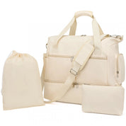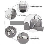 Pentru a spori functionalitatea gentii, aceasta este echipata cu o curea pentru carucior pe spate care ii permite sa fie atasata fara efort de un maner rulant al valizei pentru transport. Geanta ofera optiuni de transport versatile: poate fi tinuta in mana, poate fi purtata pe umar sau purtata pe corp datorita curelei de umar lungi detasabile. In plus, setul include doua accesorii esentiale: o geanta cu snur pentru diverse articole sau pantofi si o geanta cosmetica pentru articole de toaleta sau machiaj, astfel incat toate nevoile dvs. de ambalare sunt indeplinite cu stil.