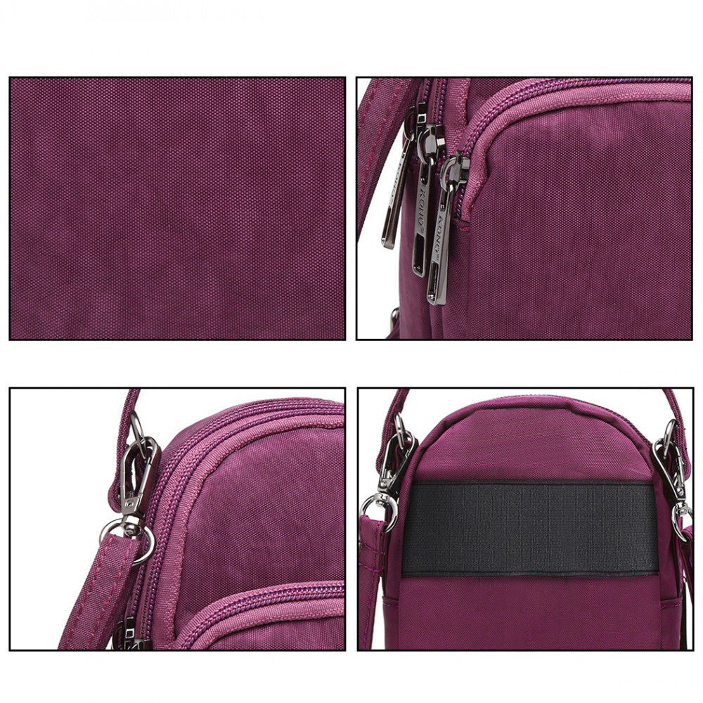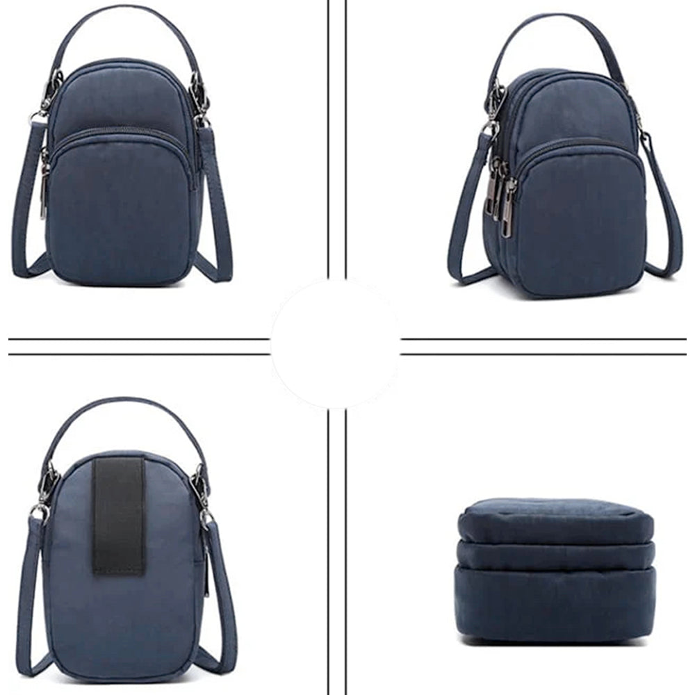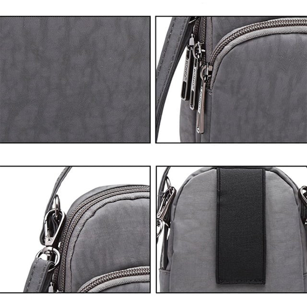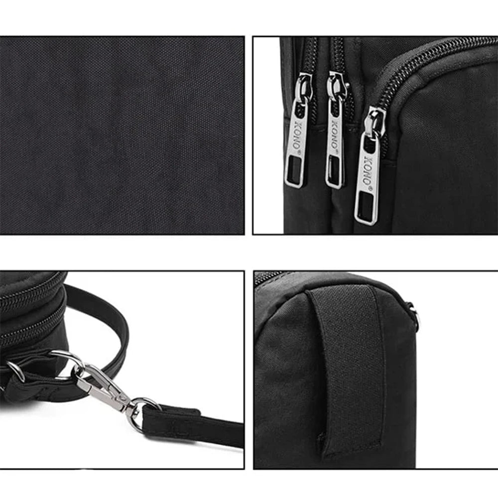 Geanta poate fi folosită in 2 moduri, ca geanta transversala sau poate fi atasata la curea si folosita ca borseta. Geanta este formată din trei buzunare cu fermoar, in compartimentul principal are buzunar deschis în interior.