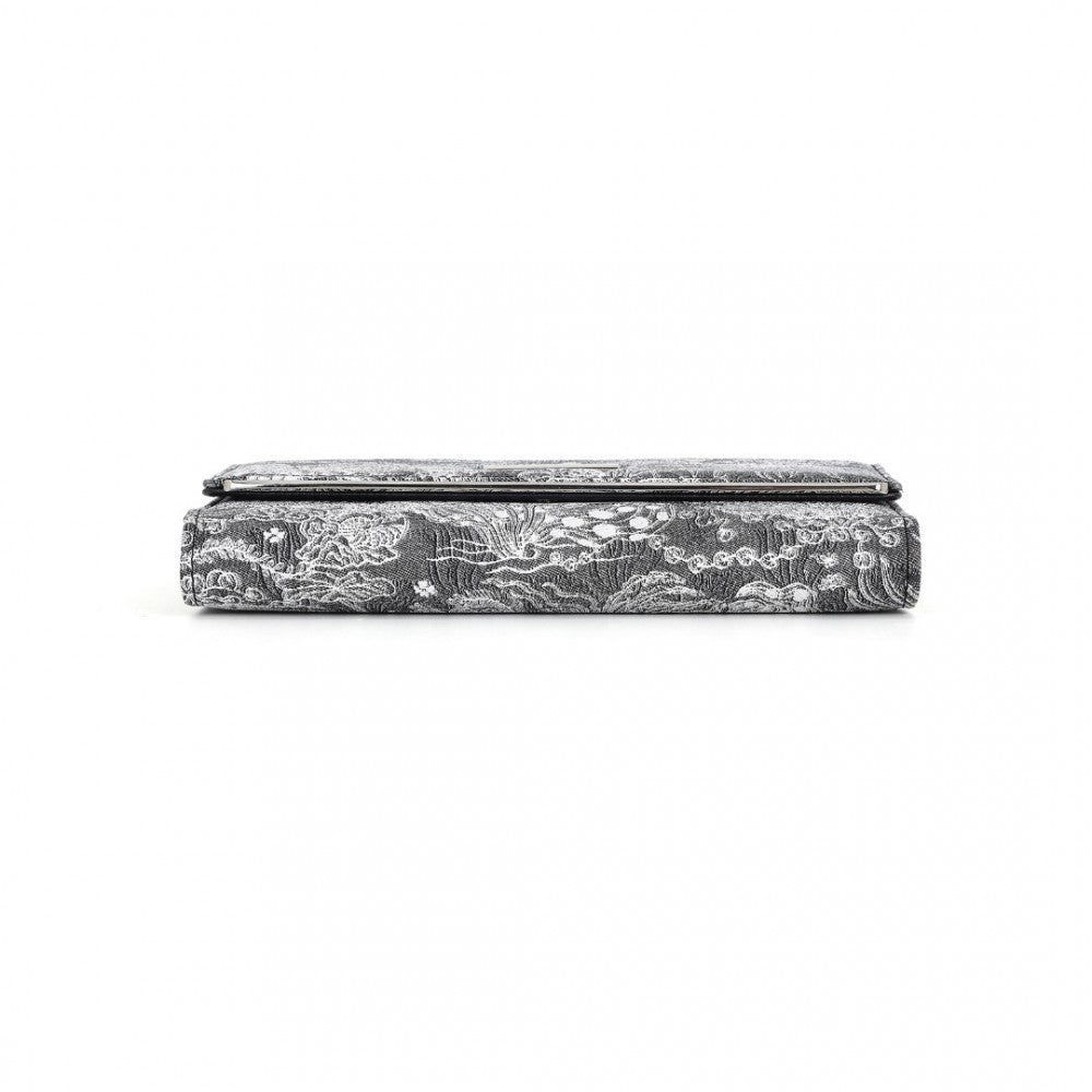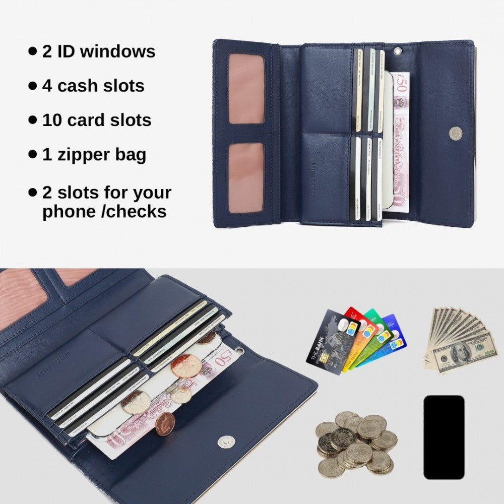 Include: doua compartimente spatioase pentru bancnote, doua sloturi pentru bancnote, un buzunar cu fermoar pentru monede si douasprezece sloturi pentru carduri. Pentru un plus de versatilitate, acest portofel vine cu un maner detasabil, permitandu-va sa-l purtati fara a folosi mainile ca o geanta de mana sau sa-l utilizati ca un clutch clasic.