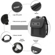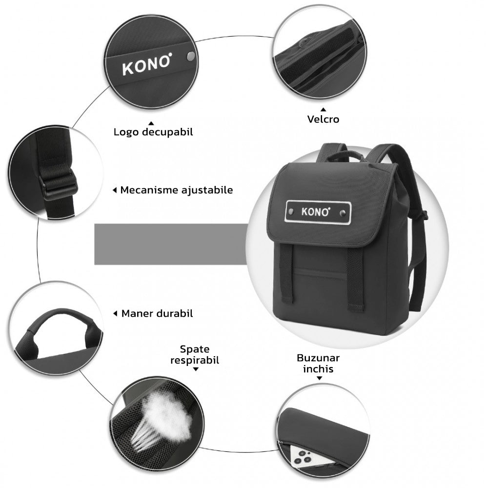 Partea din fata a rucsacului are o eticheta KONO detasabila, asezata pe o tesatura alba, care poate fi indepartata daca se doreste.