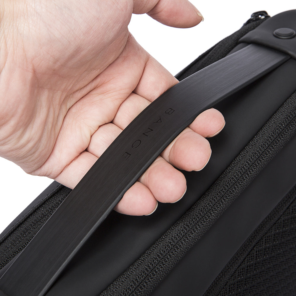 Pentru a purta geanta in maini, exista un maner superior larg din material. Compartimentul principal poate gazdui cu usurinta tot ce aveti nevoie: rechizite de birou, telefoane mobile, accesorii pentru mobil si computer. Se inchide cu fermoar dublu. Buzunarul lateral are breloc detasabil pt chei. In partea stanga exista un port USB extern pentru reincarcarea rapida a gadgeturilor din mers.