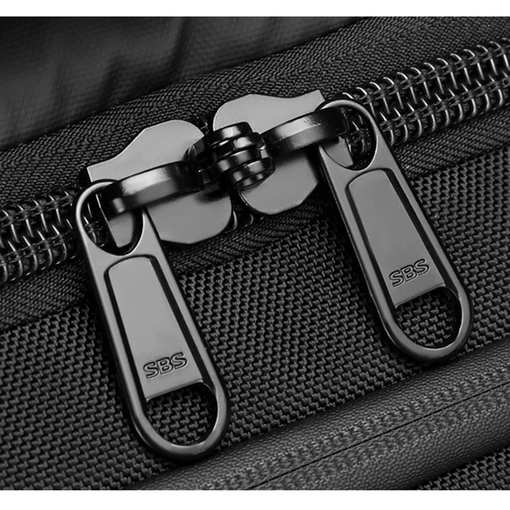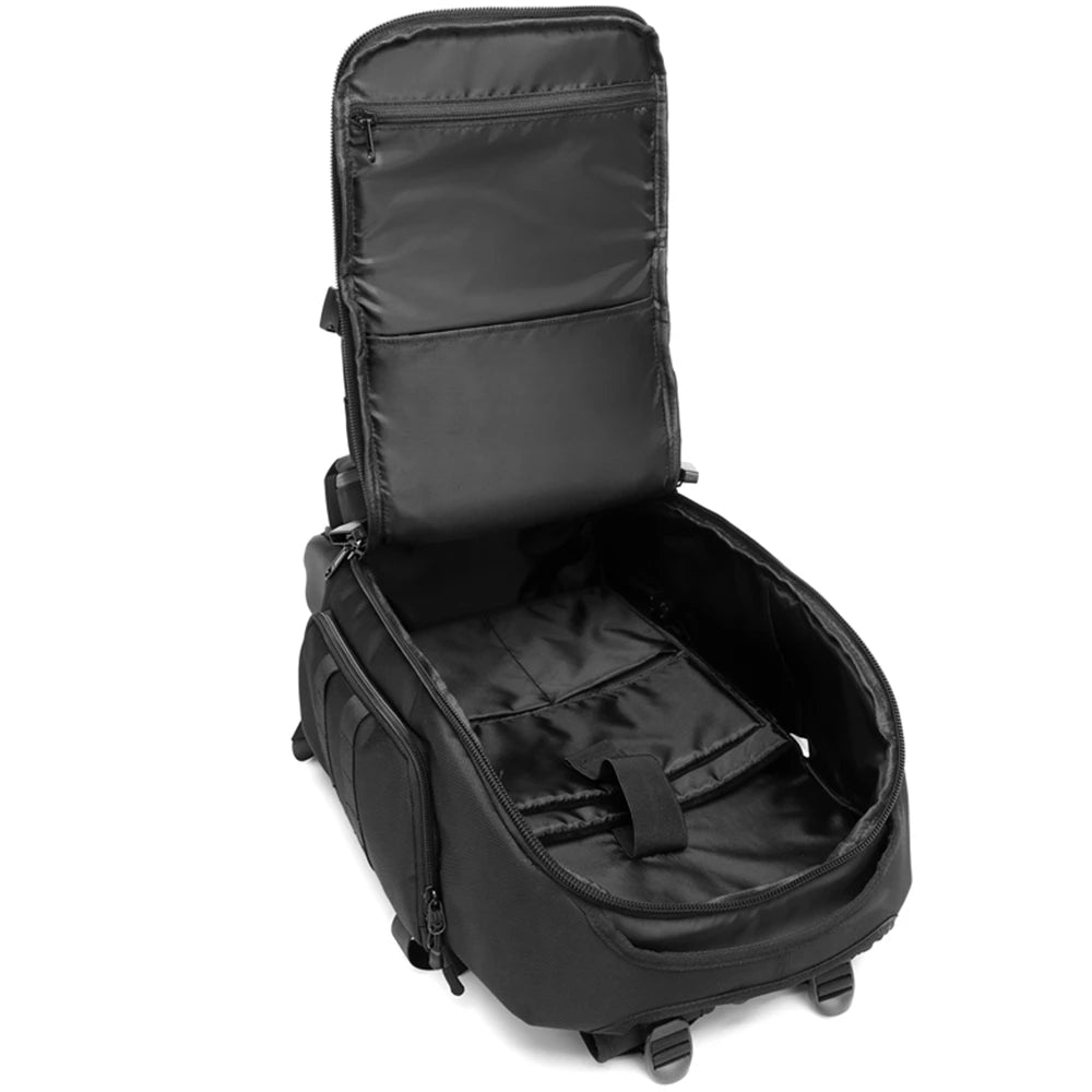 Compartimentul principal este format din 2 buzunare deschise captusite cu materiale de protectie pentru laptop si tableta, asigurate cu banda sky, 5 buzunare mai mici deschise, pentru accesorii, 1 buzunar inchis cu fermoar si un buzunar generos pentru haine si/sau alte obiecte voluminoase. Rucsacul este potrivit pentru laptop de 15,6 inch. Se inchide cu fermoar dublu. In partea frontala sint 2 buzunare inchise cu fermoar, fiecare fiind dotat cu organizatoare pentru obiecte mici, cum ar fi casti, chei, bricheta etc. Buzunarul din partea de jos inchis cu fermoar este frigorific. In partile laterale sint doua buzunare extensibile inchise cu fermoar, unul este pentru umbrela, sticla de apa sau alte obiecte care pot fi accesate cu usurinta, iar celalalt are organizator pentru pix, pasaport, breloc pentru chei si lacat TSA. Rucsacul are inclusa o husa de protectie.