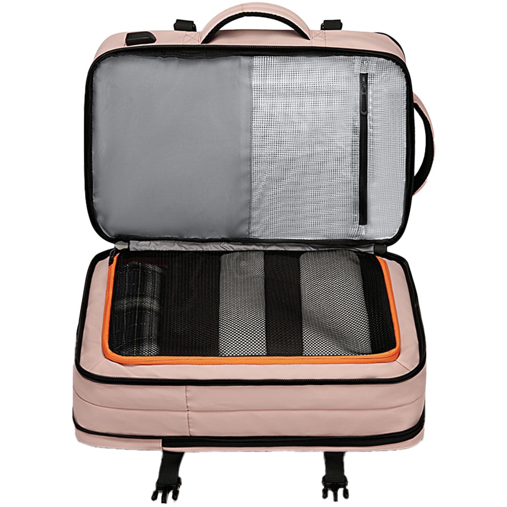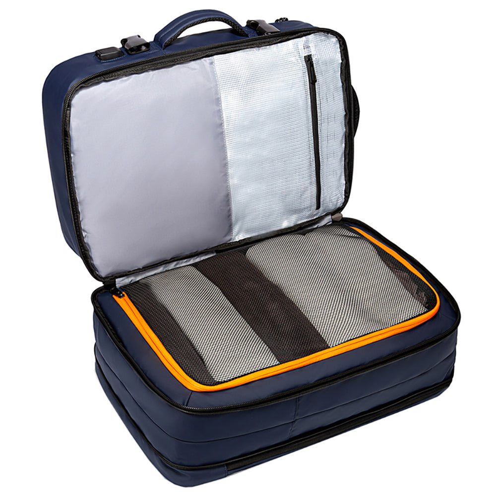 Cu ajutorul unui fermoar discret se transforma intr-o geanta de calatorie cu capacitatea de 35 l avand extra 10 cm adancime in varianta extinsa.
