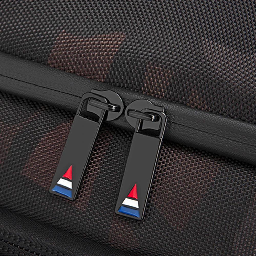 Are o banda orizontala in partea din spate pentru fixarea sa pe troler si un buzunar ascuns inchis cu fermoar. In partea dreapta exista un port USB extern pentru reincarcarea rapida a gadgeturilor din mers.