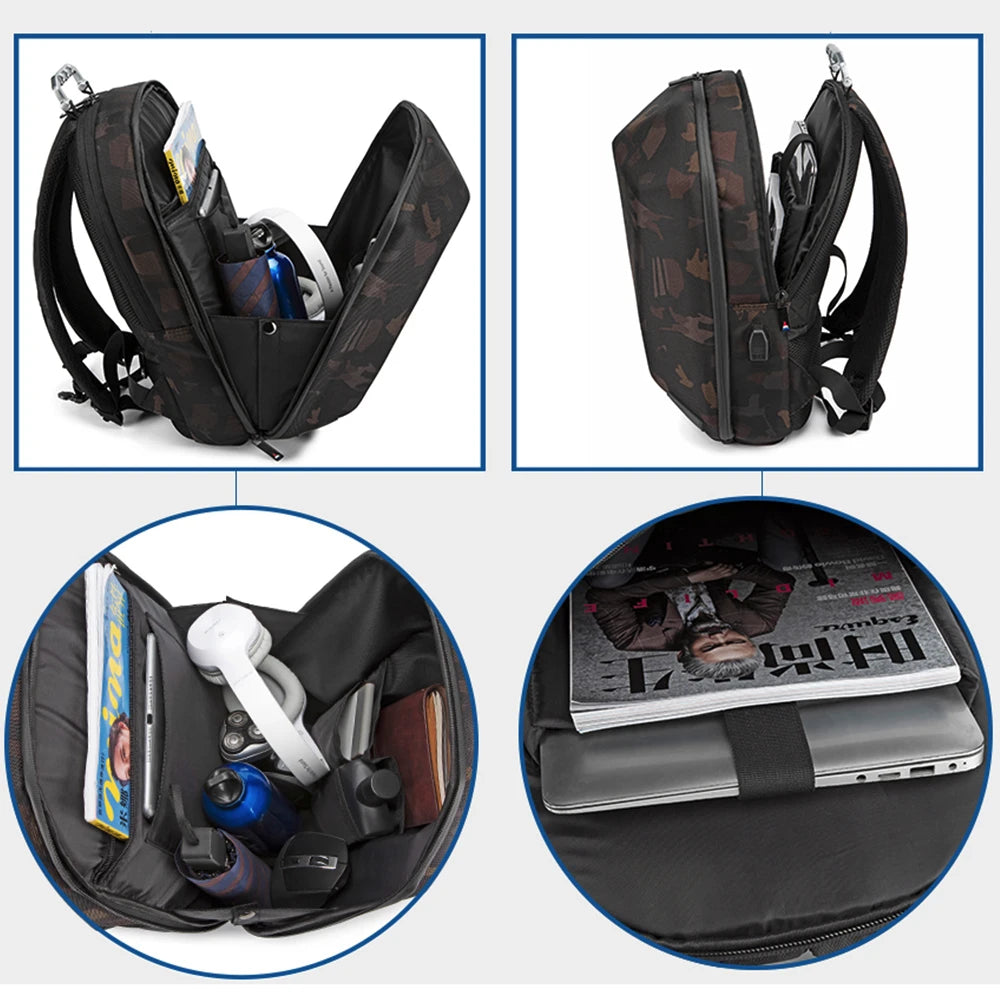 Rucsacul are 2 compartimente principale, 1 compartiment este captusit cu materiale de protectie pentru gadgeturi, inchis cu fermoar dublu, al doilea compartiment este dotat cu mai multe buzunare deschise pentru organizarea obiectelor personale, buzunarul are o deschidere larga si comoda pentru depozitarea obiectelor mai voluminoase, tot aici sta si boxa portabila care este portabila.