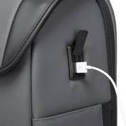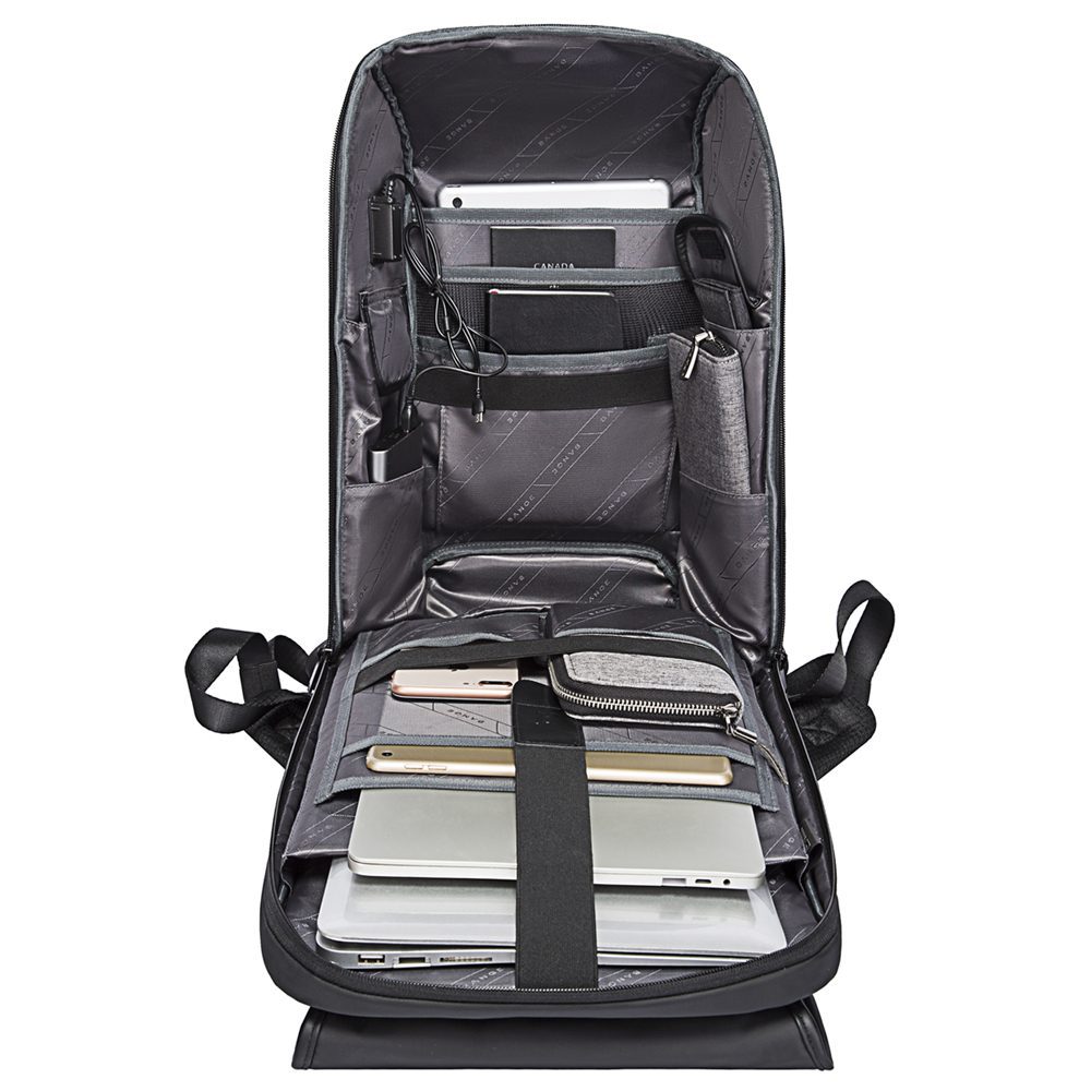 Exista, de asemenea, mai multe buzunare de dimensiuni diferite pentru obiecte mici. Se inchide cu fermoar dublu, lacat TSA si clapa magnetica. In partea stanga exista un port USB extern pentru reincarcarea rapida a gadgeturilor din mers.