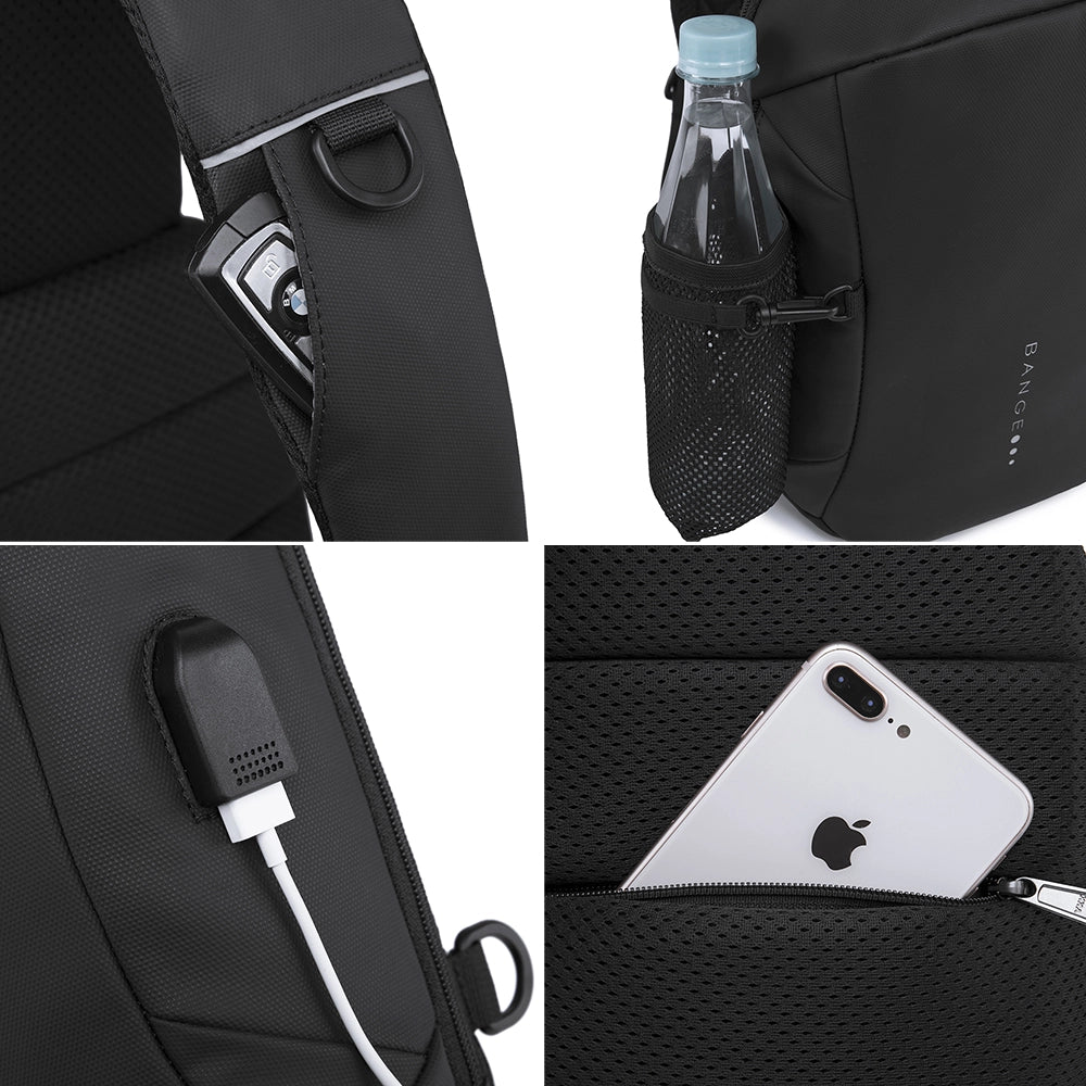 Rucsac unisex crossbody, din poliester rezistent la apa cu port USB si buzunar ascuns pe spate, BANGE BG1912
