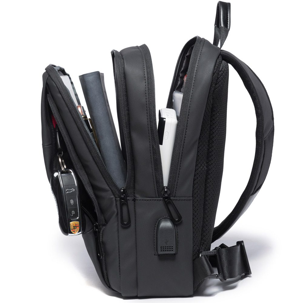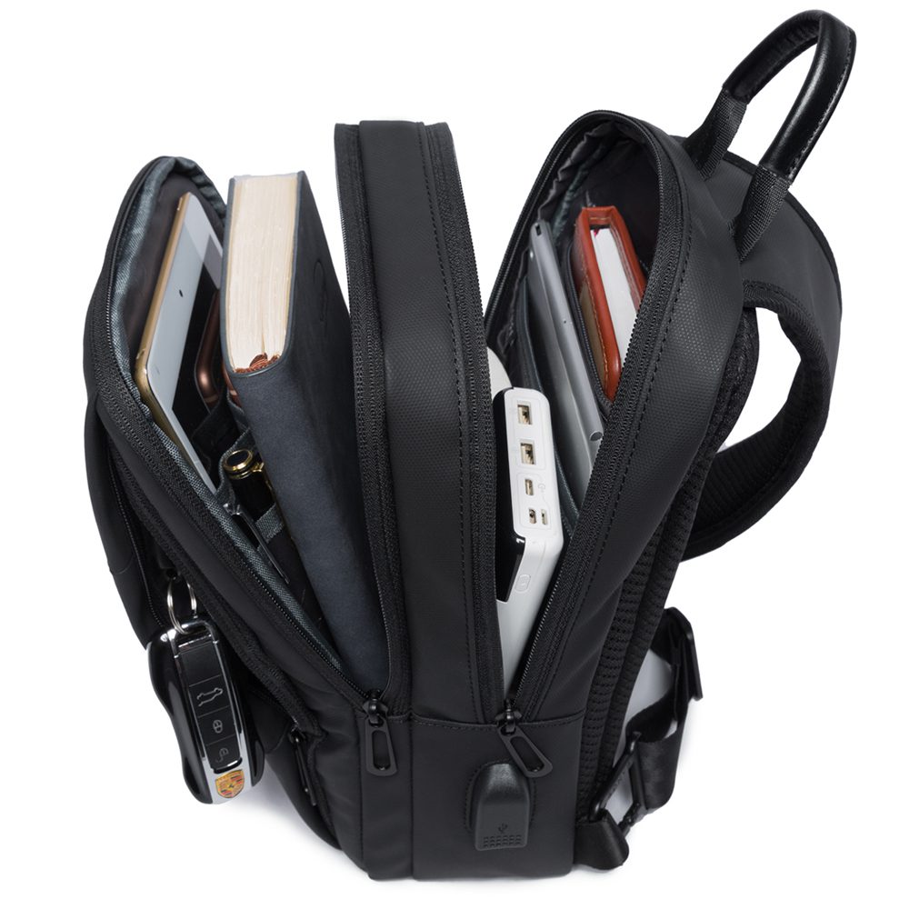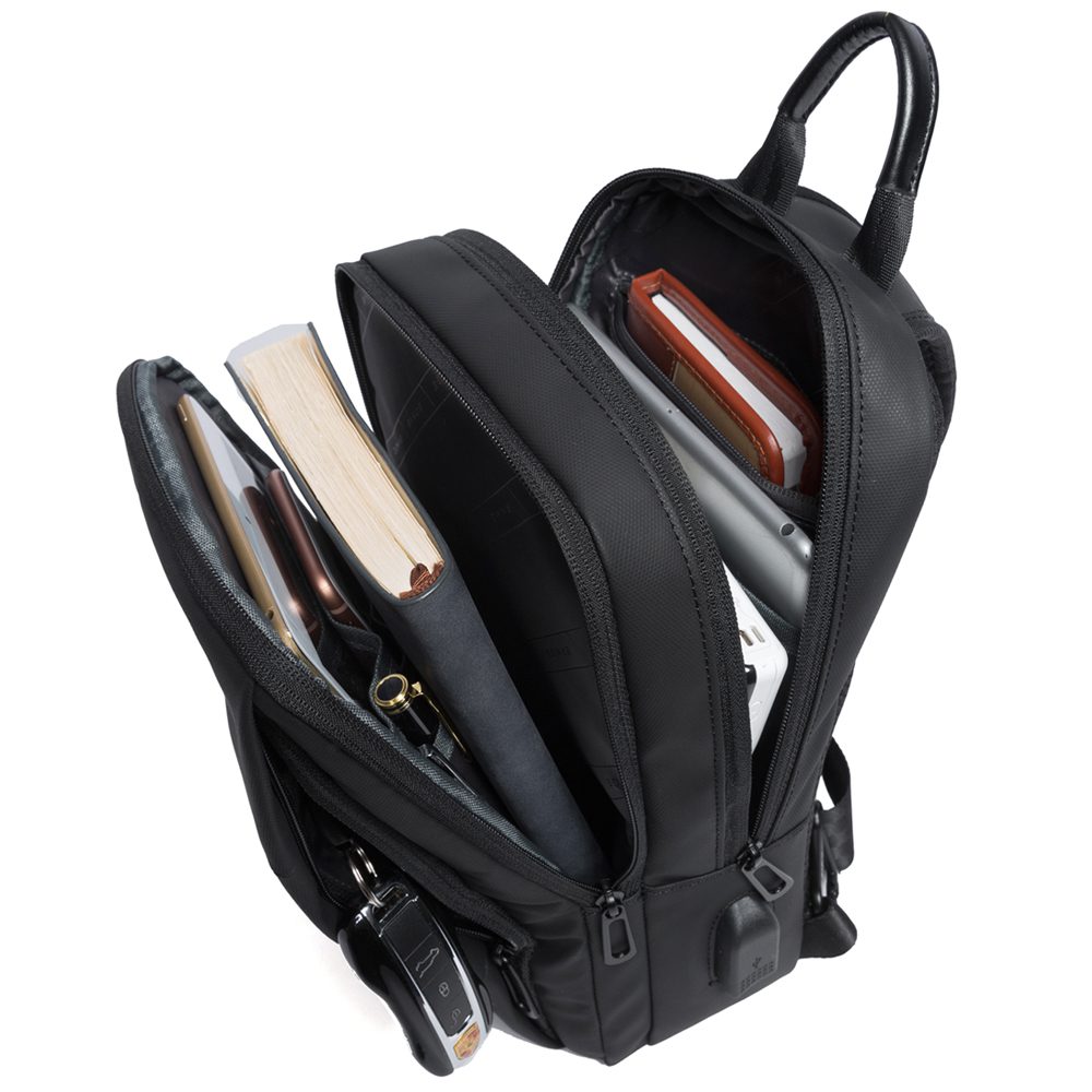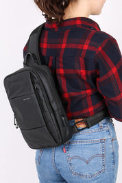 Multifunctional: Poate fi folosit ca rucsac pe un singur umar sau geanta pentru piept/spate (crossbody). Prezinta doua compartimente centrale, in care veti regasi buzunare deschise si cu fermoar, buzunare pentru pixuri si stilouri, 1 buzunar frontal cu fermoar perfect pentru o tableta dotat cu un keyholder, un buzunar antifurt cu fermoar in partea din spate. Rucsacul este dotat cu un port USB extern cu cablu de incarcare incorporat ( nu include o baterie, aveti nevoie de un acumulator extern pentru a va incarca telefonul).